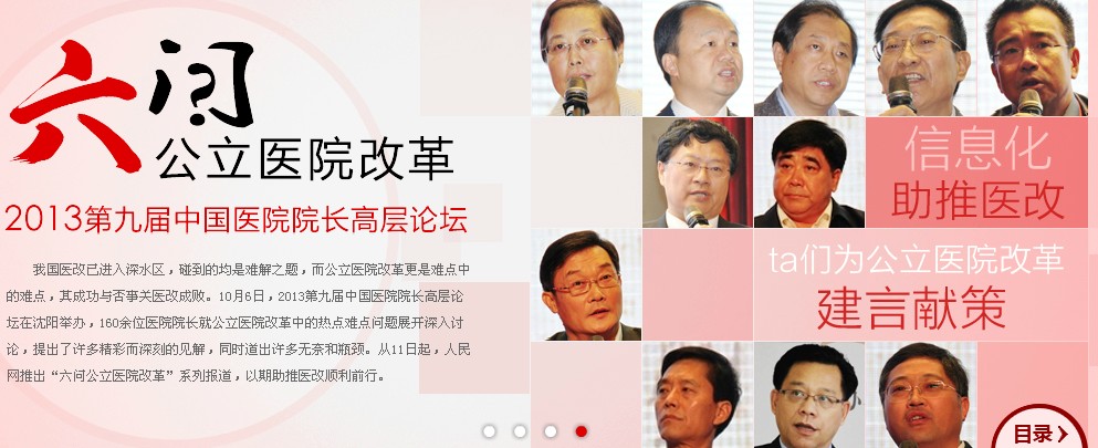 •     2013第九屆中國醫(yī)院院長高層論壇在沈陽勝利召開。本屆論壇以“信息化助推醫(yī)改”為核心議題,由衛(wèi)生部新聞宣傳中心、中國醫(yī)院協(xié)會、人民日報社人民網(wǎng)和遼寧省衛(wèi)生廳共同主辦,中國醫(yī)科大學盛京醫(yī)院承辦。