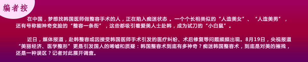 在韓國(guó)著名整形醫(yī)院ID醫(yī)院的論壇上計(jì)算赴韓整形費(fèi)用的版塊,記者粗略計(jì)算了一下,為了使眼睛更大,做一個(gè)簡(jiǎn)單的雙眼皮的手術(shù)價(jià)格大約在2000000韓元約合11000元人民幣左右。網(wǎng)站提示“本價(jià)格是按照首爾整容一條街——狎鷗亭街所有整形外科的平均價(jià)格進(jìn)行統(tǒng)計(jì)的!倍趪(guó)內(nèi)做此類(lèi)手術(shù),最便宜的只需2000元左右,價(jià)格高出幾倍,再加上赴韓的差旅費(fèi),中國(guó)人基本上成了待宰的“冤大頭”。