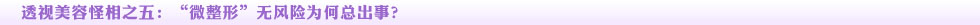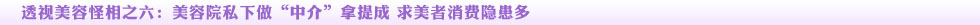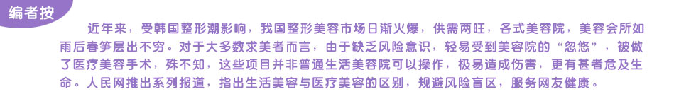 人民網北京3月19日電 (記者馬曉慧)近日,人民網刊發(fā)《“微整形”無風險為何總出事?》等透視美容怪相系列報道引發(fā)輿論關注。很多網友已了解到在不具備醫(yī)療資質的美容院中做微整形存在的風險。其實除了醫(yī)療風險,美容院里還存在很多消費陷阱!坝幸恍┥蠲廊菰褐雷约簺]有從事整形手術的資質,于是以簽約形式和有資質的醫(yī)療美容機構(整形醫(yī)院)合作,向這些機構介紹消費者,從中抽取提成”,中國醫(yī)學科學院整形外科醫(yī)院副院長祁佐良在接受人民網記者采訪時指出,“有時提成會高達50%,并且生活美容院不承擔任何風險![詳細] |