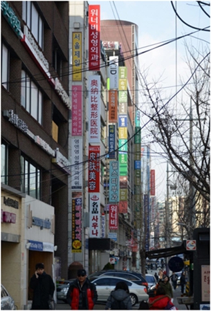 韓國首爾江南地區(qū)的狎鷗亭洞是當(dāng)?shù)刂摹罢我粭l街”,站在狎鷗亭地鐵口,無論朝哪個(gè)方向看,都是密密層層的整形醫(yī)院招牌,一公里半徑內(nèi)云集了三四百家整形機(jī)構(gòu)。新的招牌還在不斷掛出,越來越多機(jī)構(gòu)不得不扎堆在同一幢建筑里。