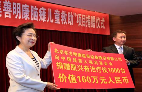 人民網(wǎng)北京5月9日電 (盛月)近日,由“點(diǎn)亮腦癱兒童希望之光——集善明康腦癱兒童救助”捐贈儀式在北京舉行。捐贈儀式上,北京東方明康醫(yī)用設(shè)備股份有限公司向中國殘疾人福利基金會捐贈1000臺主要用于各類腦癱兒童康復(fù)治療的MK-A型肌興奮治療儀。