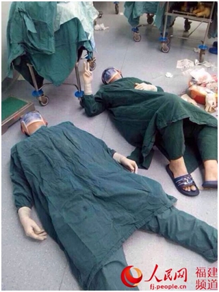 2014年6月22日,在手術(shù)室里連續(xù)工作了32個(gè)小時(shí)后,福建醫(yī)科大學(xué)附屬協(xié)和醫(yī)院的醫(yī)護(hù)人員紛紛累癱在手術(shù)臺(tái)邊,陳松醫(yī)生給出了勝利的手勢(shì)。