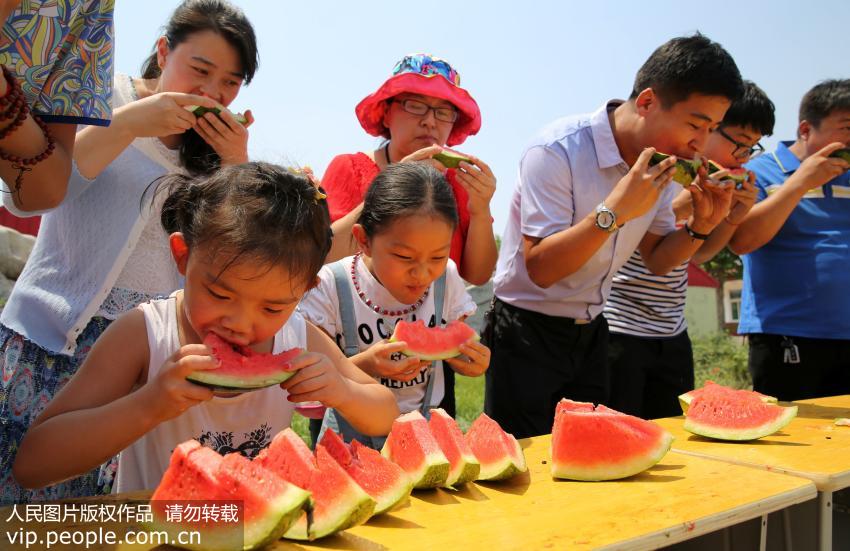 資料圖:6月18日,游客們在進(jìn)行吃西瓜比賽。(郝群英/人民圖片)