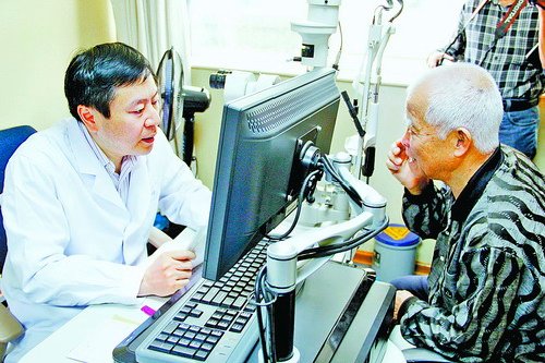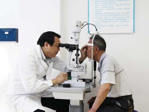 著名眼科專家盧奕教授為預(yù)約患者檢查眼睛