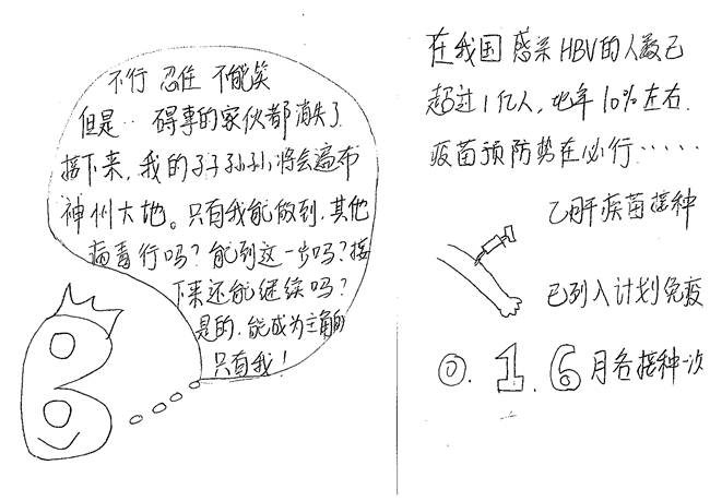 在本篇漫畫中,作品采用了詼諧的簡筆畫形式,力求能夠簡單明了地展現(xiàn)肝炎病毒的種類、傳播途徑、引發(fā)的后果以及在我國乙肝防治的現(xiàn)狀和預(yù)防措施。漫畫中相應(yīng)的部分也有一些文字性的介紹,一目了然,希望讀者能在會(huì)心一笑中增強(qiáng)對病毒性肝炎的防控意識,達(dá)到疾病防控知識傳播的目的。(圖文/廈門大學(xué)蘭尤)