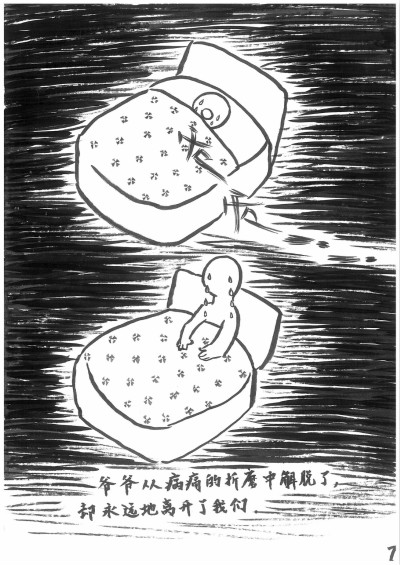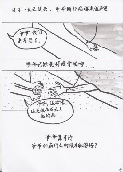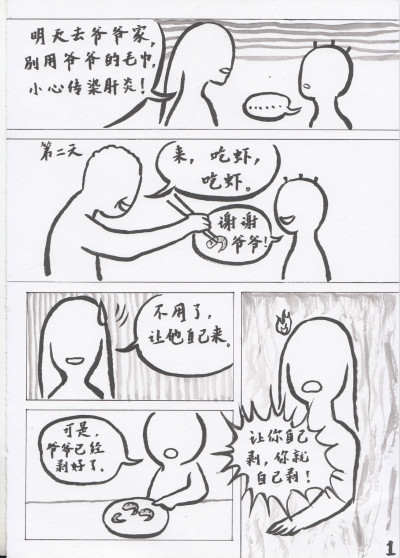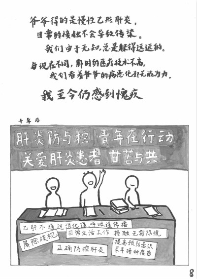 該漫畫根據(jù)個(gè)人親身經(jīng)歷改編。主角的爺爺是慢性乙肝患者,本作品講述了孫子與爺爺過往經(jīng)歷的斷片記憶,形象真實(shí)地再現(xiàn)了乙肝患者的生活。(圖文/廈門大學(xué)陳威)