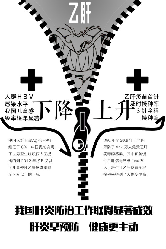 該作品通過海報(bào)的形式為讀者介紹了我國乙肝防治的現(xiàn)狀,作品中一個(gè)正要封鎖的拉鏈即將封住名為“乙肝”的惡魔,形象地顯示出我國為改善乙肝感染現(xiàn)狀做了諸多方面的努力,并通過列舉一個(gè)“下降”,一個(gè)“上升”來彰顯我國在乙肝防治方面的已取得的巨大成就。(圖文/華中師范大學(xué)許旎)