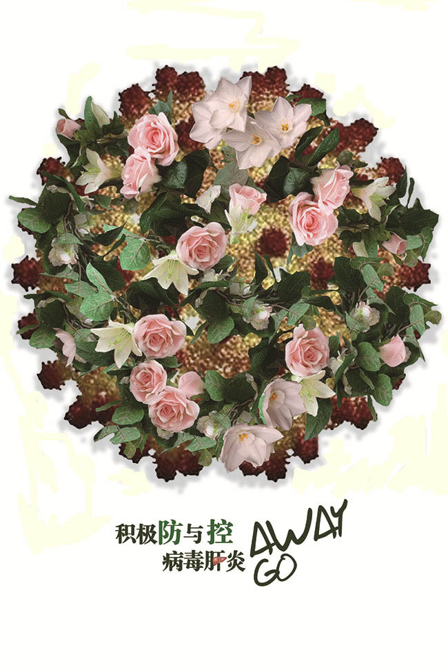 該作品呈現(xiàn)給讀者的是一個(gè)被自然、健康、有生命力的花兒們纏繞的乙肝病毒,作者運(yùn)用年輕活潑的表達(dá)形式鼓勵(lì)患者積極面對(duì)乙肝病毒,并堅(jiān)信頑強(qiáng)防控的人必將戰(zhàn)勝病毒。(圖文/廈門大學(xué)武劉鑫琳)