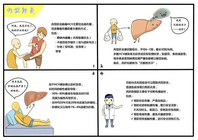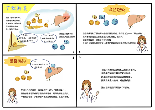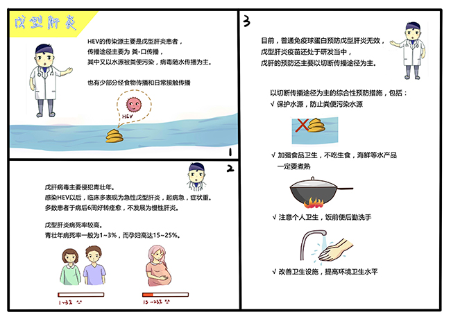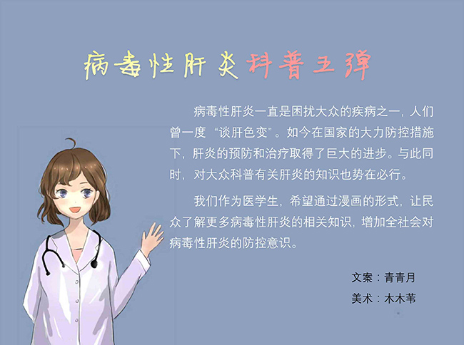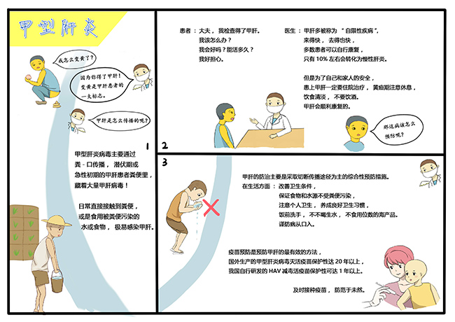 病毒性肝炎是由多種肝炎病毒引起的常見傳染病,具有傳染性強、傳播途徑復(fù)雜、流行面廣泛,發(fā)病率較高等特點。該作品通過5幅生動形象的漫畫,分別介紹了甲、乙、丙、丁、戊五種病毒性肝炎的傳播途徑、病情發(fā)展以及防治措施。漫畫或以患者的視角講述,或以接受免疫的兒童的視角講述,或以病毒的視覺講述,形式多樣,通俗易懂。同時,小醫(yī)生的角色貫穿整個系列的漫畫,生動形象地對與病毒性肝炎相關(guān)的醫(yī)學(xué)內(nèi)容進(jìn)行科學(xué)講述。(圖文/北京大學(xué)魏林葦 馬婧玥)