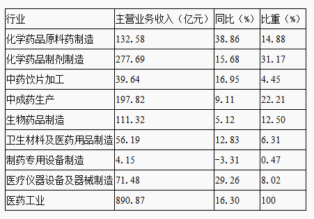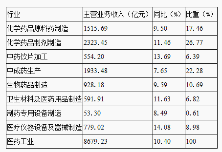 2016年1-4月,醫(yī)藥工業(yè)規(guī)模以上企業(yè)實現(xiàn)主營業(yè)務(wù)收入8679.23億元,同比增長10.4%,高于全國工業(yè)整體增速8.1個百分點,較上年同期提高0.89個百分點。各子行業(yè)中,主營業(yè)務(wù)收入增長最快的是醫(yī)療儀器設(shè)備及器械、中藥飲片。