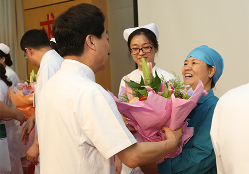 (圖為:趙玉沛院長為援藏醫(yī)療隊員獻花 攝影 王鵬飛)