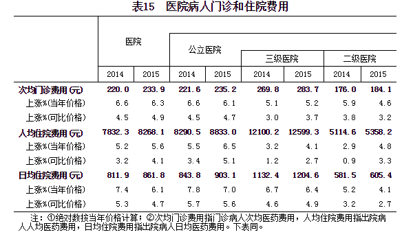 根據(jù)統(tǒng)計(jì)數(shù)據(jù),按可比價(jià)格計(jì)算,2015年公立醫(yī)院次均門診費(fèi)用上漲4.7%;人均住院費(fèi)用上漲5.1%;鄉(xiāng)鎮(zhèn)衛(wèi)生院門診和住院費(fèi)用分別上漲4.2%和6.1%。病人費(fèi)用漲幅低于城鄉(xiāng)居民人均收入增長速度(城鎮(zhèn)居民6.6%,農(nóng)村居民7.5%)。醫(yī)藥費(fèi)用增長受人口老齡化、慢性疾病模式,以及醫(yī)療技術(shù)進(jìn)步等多種因素的影響,應(yīng)加快實(shí)施醫(yī)保支付方式改革,引導(dǎo)和規(guī)范醫(yī)療行為,控制費(fèi)用不合理增長。
