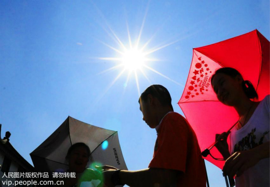幾名市民頂著驕陽烈日在蘇州市臨頓路上撐傘行進。(王建中/人民圖片)