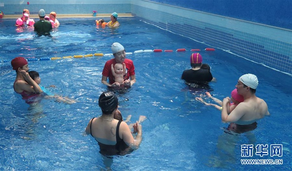 8月11日,北京龍格親子游泳俱樂部教練(中)教家長如何帶領(lǐng)自己孩子游泳。(圖片來源:新華網(wǎng))