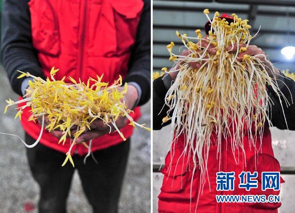 天津?qū)氎鎱^(qū)一家蔬菜公司的工人展示該公司生產(chǎn)的正常的黃豆芽(右)和綠豆芽(左)。(新華社記者 翟健嵐 攝)