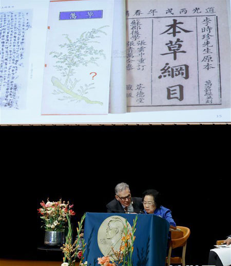 2015年12月7日,中國(guó)女藥學(xué)家屠呦呦出席在瑞典卡羅琳醫(yī)學(xué)院舉辦的諾貝爾生理學(xué)或醫(yī)學(xué)獎(jiǎng)得主講座,為瑞典民眾介紹青蒿素等科研成果。
