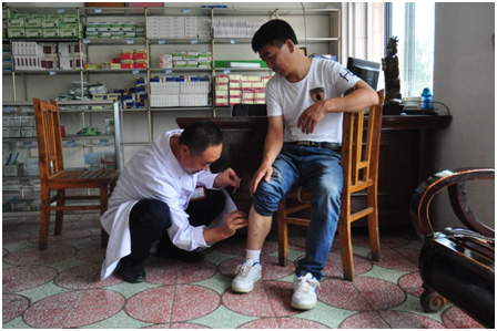 此時(shí)的王虎軍正蹲在地上,給一位四十來歲的男患者的腿上施針;一位五十幾歲的女患者坐在不遠(yuǎn)處的木椅子上,手臂上也扎著針灸;坐在靠窗邊的木頭沙發(fā)上,還有三位患者等待就醫(yī)。施完針,王虎軍大步走回座位上,給一個(gè)七旬的老婦量血壓,老人身后還站著一位懷抱嬰兒的年輕母親和三五個(gè)男女,時(shí)不時(shí)有幾個(gè)小朋友嬉鬧著從這些大人的身邊跑來跑去……原來,這些都是一早來找王虎軍看病的患者和家屬。見到記者進(jìn)來,王虎軍根本抽不出時(shí)間和記者打招呼,只能歉意地點(diǎn)點(diǎn)頭,示意等候片刻。