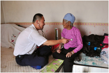 還有一次,有個(gè)鄰居打電話求助,說他年近九旬的老母早飯后出現(xiàn)氣短、嘔吐并伴有上腹痛?紤]到老人行動(dòng)不便,情況危急,王虎軍趕緊放下診所內(nèi)的患者過去出診。經(jīng)過觀察發(fā)現(xiàn),嘔吐物為胃內(nèi)容物,脈膊疾且結(jié)代,老人出冷汗。王虎軍有對(duì)老人聽診,發(fā)現(xiàn)第一心音低鈍且心律紊亂。他趕緊告訴這家人,懷疑老人突發(fā)心梗需要住院治療。據(jù)王虎軍回憶,這家人可能不知病情的嚴(yán)重性,就一直讓他給老人輸液。后來又說不懂該如何辦理住院手續(xù),又怕路上病人有什么不測(cè)要求王虎軍送他們?nèi)メt(yī)院。為了能讓老人盡快得到救治,王虎軍就開著自己的車把病人和家屬送往烏審旗人民醫(yī)院。多虧送得及時(shí),老人最后轉(zhuǎn)危為安。
