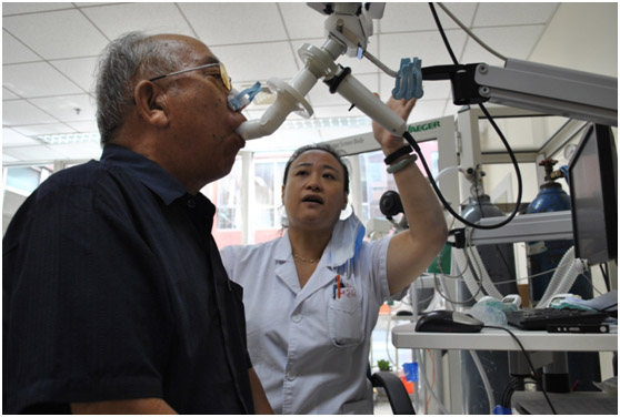 這位老人是住院患者,有十多年吸煙史,患有慢性阻塞性肺病,對著儀器管子吸氣時不得不竭盡全力,肩膀聳起,喉嚨發(fā)出嘶嘶聲!盎颊邷y肺功能很辛苦,要做脈沖震蕩、流速容量環(huán)、彌散功能測定等好幾項檢查,每一項又需要重復至少3次。怕患者會泄氣,要一直鼓勵他們,幫助他們配合完成檢查!背约t說。