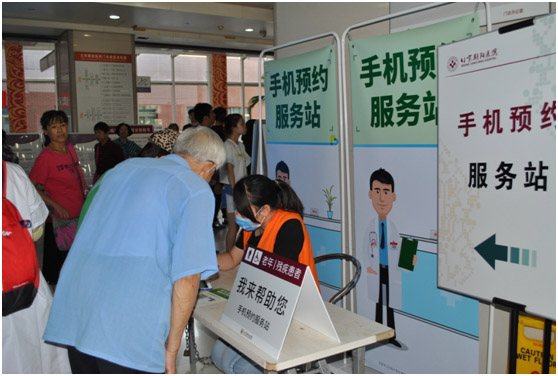 朝陽醫(yī)院的門診大廳上方,醒目地懸掛著紅色條幅——“推廣多渠道掛號 方便患者就醫(yī)”。大廳內(nèi)還設(shè)有手機預(yù)約服務(wù)站,由志愿者手把手指導老年和殘疾人患者如何不出家門,不進醫(yī)院,動動手指,就能在手機微信平臺上完成預(yù)約掛號。