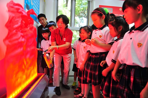 圖為小學生們在紅十字生命健康安全體驗教室學習滅火技巧
