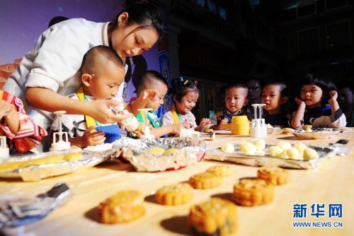 職業(yè)體驗教師在指導小朋友制作月餅 (圖片來源:王建威/新華社)