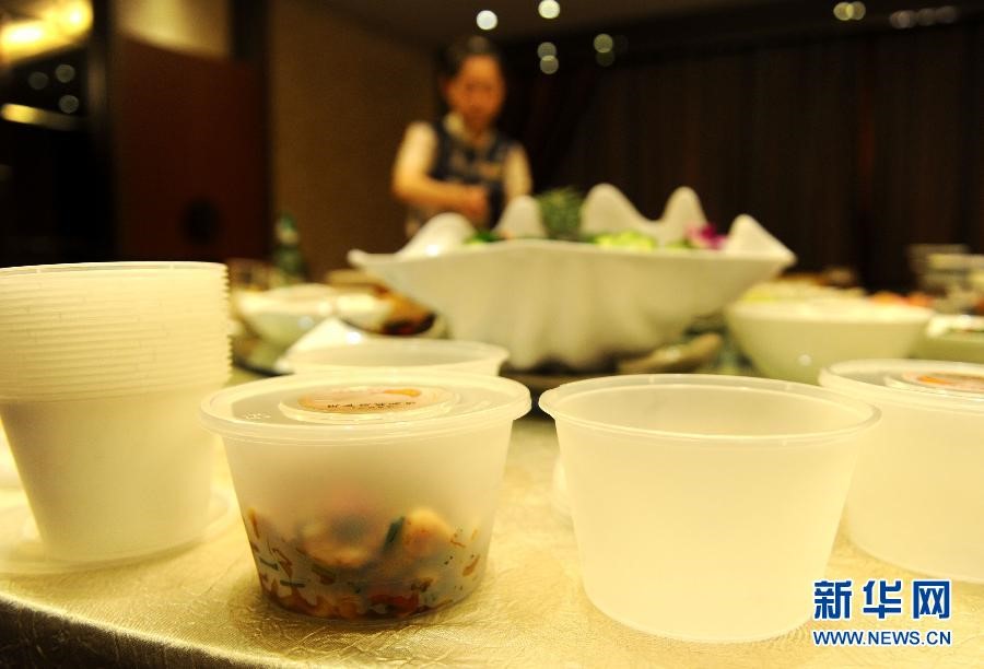 服務(wù)人員在用塑料餐具為顧客打包食品 (圖片來源:劉軍喜/新華社)