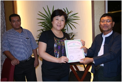 緬甸第一執(zhí)政黨鞏發(fā)黨書記為李立梅博士頒發(fā)榮譽(yù)證書