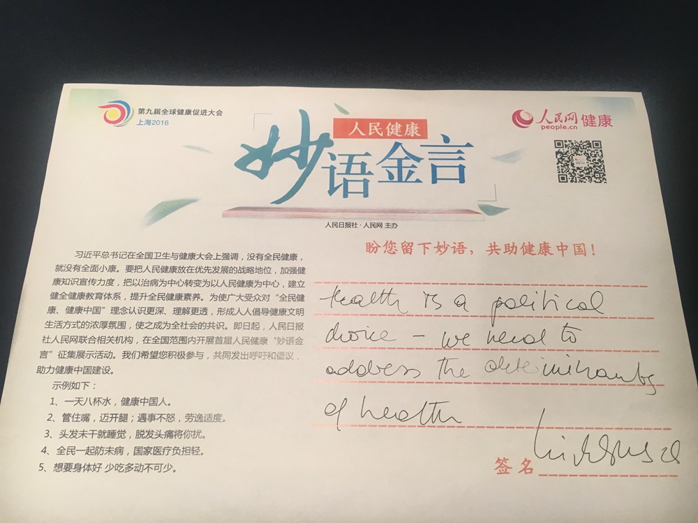 瑞士日內(nèi)瓦大學(xué)國(guó)際關(guān)系與發(fā)展研究院客座教授Ilona kickbush 參與人民健康妙語金言征集活動(dòng)