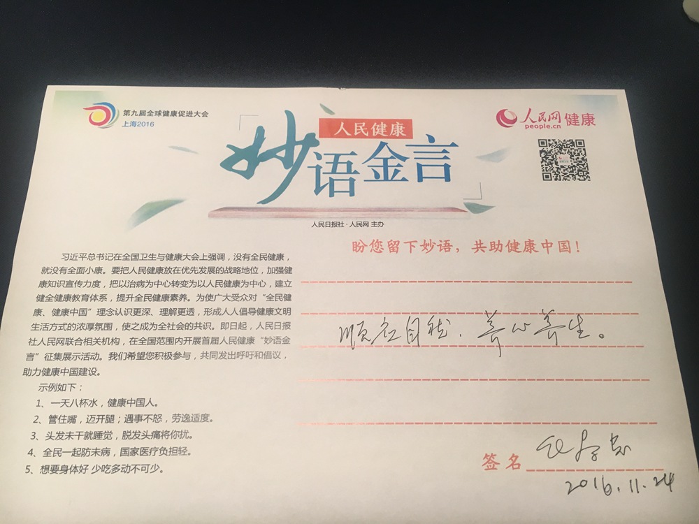 中國國家衛(wèi)生計生委宣傳司司長毛群安參與人民健康妙語金言征集活動