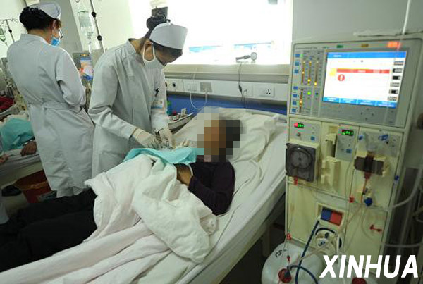 河北三河市燕郊人民醫(yī)院的醫(yī)護(hù)人員正在為身患尿毒癥的農(nóng)村患者做免費(fèi)血液透析。(圖片來(lái)源:新華網(wǎng))