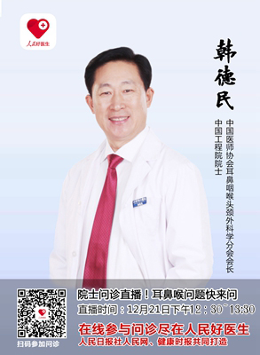 12月21日(周三)下午12:30-13:30,由人民日報社人民網(wǎng)、健康時報聯(lián)手打造的“人民好醫(yī)生”客戶端將邀請中國工程院院士韓德民進(jìn)行視頻、圖文直播,在線解答各種耳鼻喉問題。