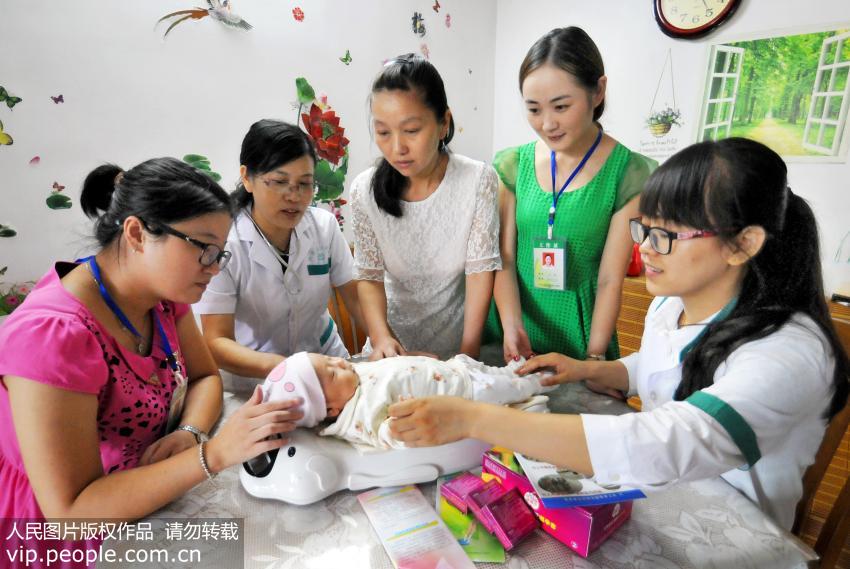 安徽省安慶市迎江區(qū)先鋒社區(qū)計生專干及社區(qū)醫(yī)護人員叮囑新媽媽,新生兒30天需接種乙肝疫苗(黃有安/人民圖片)