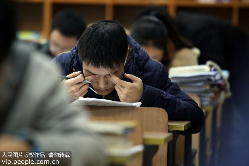 常州大學(xué)的考研學(xué)生在按摩眼睛緩解疲勞。(陳暐/人民圖片)