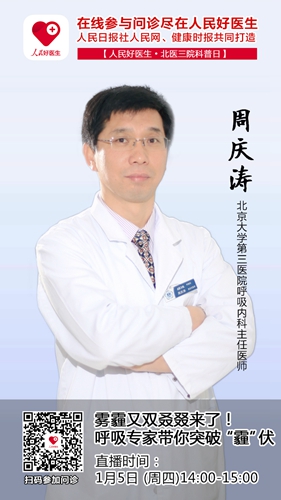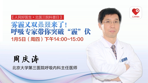 朋友別慌!1月5日(周四)14:00-15:00,由“人民好醫(yī)生”客戶端推出的“人民好醫(yī)生·大型三甲醫(yī)院科普宣傳日”系列專場活動,將迎來北京大學(xué)第三醫(yī)院科普宣傳日專場。北京大學(xué)第三醫(yī)院呼吸內(nèi)科專家周慶濤教授帶著他的獨家克霾秘籍,與廣大網(wǎng)友分享交流,還不快快關(guān)注!
