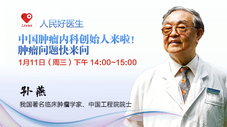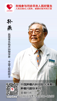 1月11日(周三)14:00-15:00,由人民日?qǐng)?bào)社人民網(wǎng)、健康時(shí)報(bào)聯(lián)手打造的“人民好醫(yī)生”客戶端將邀請(qǐng)我國(guó)著名臨床腫瘤學(xué)家、中國(guó)工程院院士孫燕進(jìn)行視頻、圖文直播,在線解答關(guān)于腫瘤的預(yù)防、放化療治療等相關(guān)問題,期待您的提問和參與。