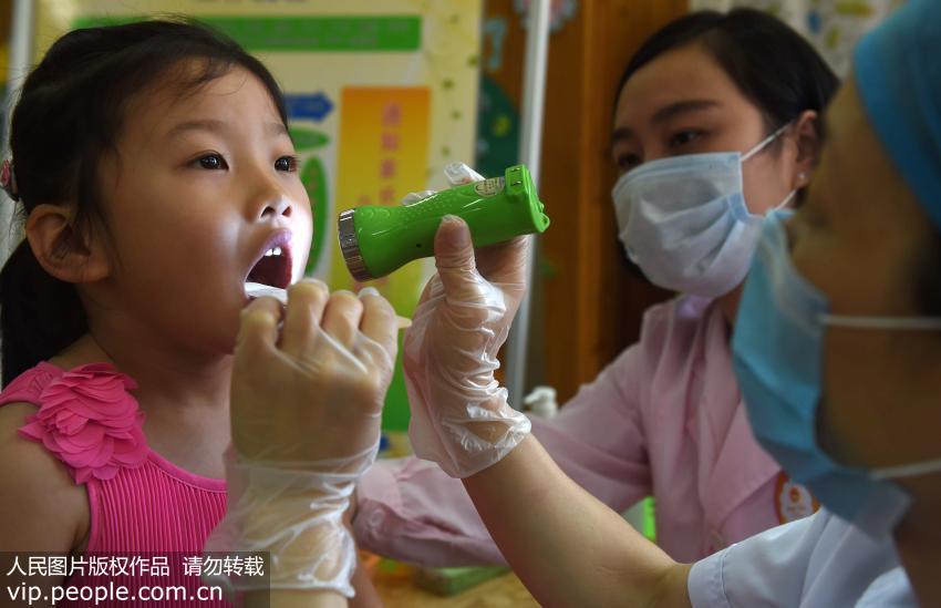 2015年6月12日,在合肥市瑤海區(qū)九獅水岸幼兒園,疾控工作人員正在對孩子們進(jìn)行手足口病檢查和采樣,宣傳講解手足口病的相關(guān)防控知識(shí)。(解琛/人民圖片)