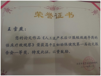 團(tuán)隊(duì)積累了豐富的臨床資料,經(jīng)過整理分析后,撰寫的論文《人工流產(chǎn)后口服短效避孕藥的臨床療效觀察》獲得2013年度院內(nèi)論文比賽一等獎(jiǎng),并在中文核心期刊《中國(guó)婦幼保健》雜志上發(fā)表。