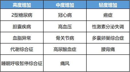 認(rèn)知-行為是減重方案的首要調(diào)節(jié)因素,只有肥胖者充分意識到肥胖的危害性、減重后的獲益,他們才有堅(jiān)持下去的動(dòng)力。肥胖病并發(fā)其他疾病的風(fēng)險(xiǎn)非常高,如下圖所示,肥胖病會(huì)不同程度增加病發(fā)其他疾病的風(fēng)險(xiǎn)。