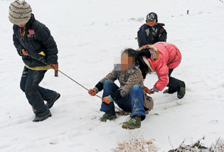 廣西桂林市全州縣東山瑤族鄉(xiāng)清水街,孩子們在雪地里玩耍。(周華/新華社)