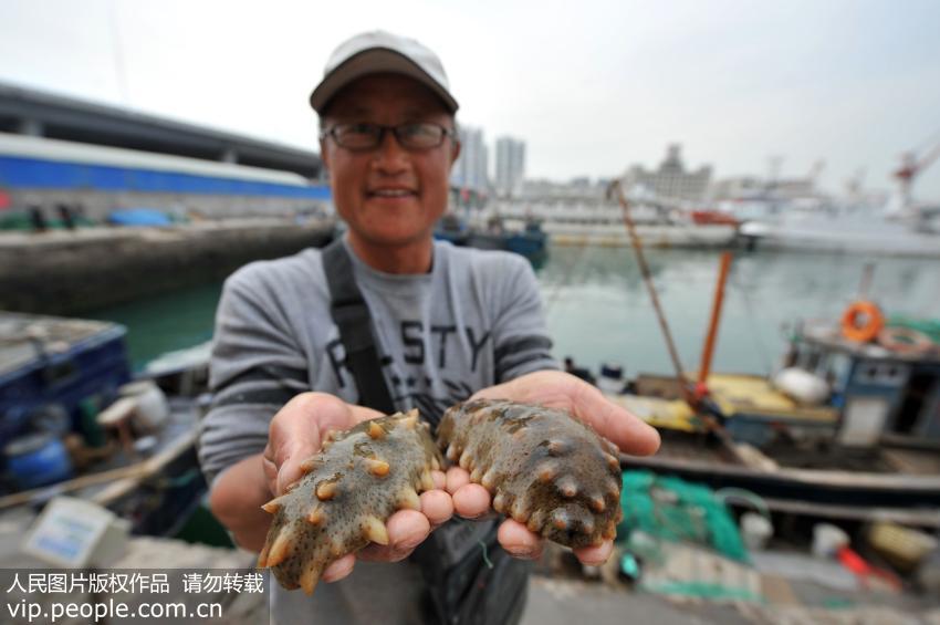 一名漁民在青島小港碼頭上售賣當(dāng)天捕獲的半斤重野生海參。(王海濱/人民圖片)