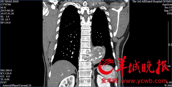 一位患者的脊柱已被腫瘤包圍。(圖片來源:金羊網(wǎng))