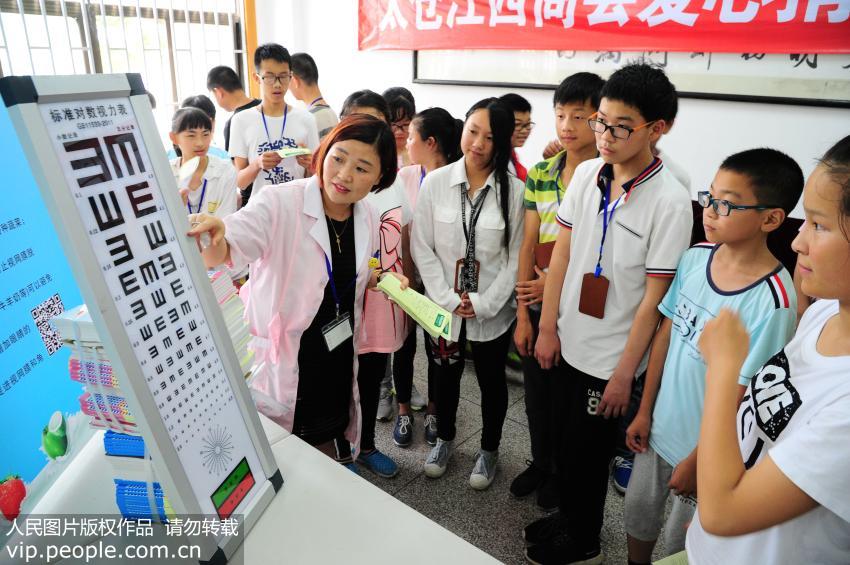 江蘇省太倉市保視明視光配鏡中心為中小學(xué)生開展“暑期關(guān)愛視力進校園”視力普查、免費送眼鏡、視力保護宣傳等活動。(計海新/人民圖片)