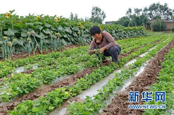 河北省邢臺(tái)市新河縣南馮村一農(nóng)民在花生地里除草。(楊世堯/新華網(wǎng))