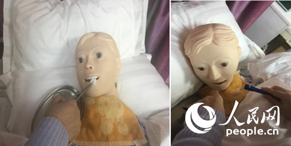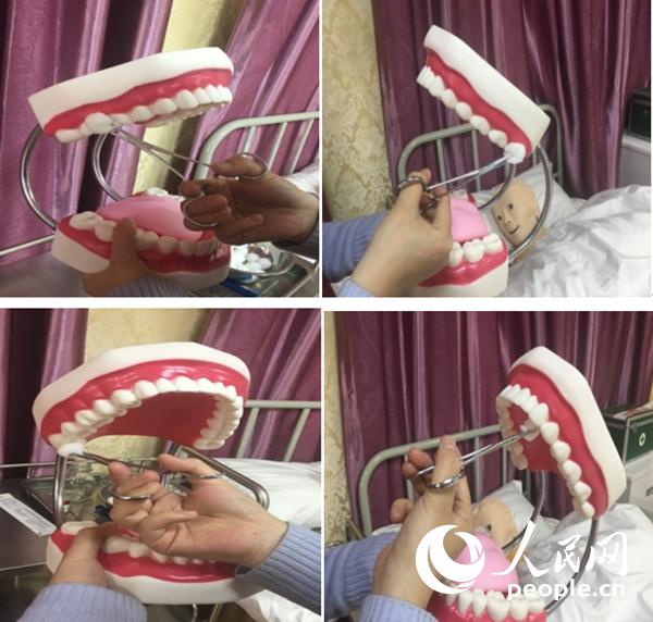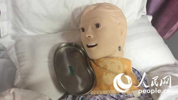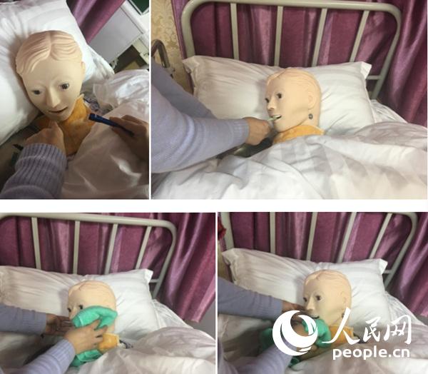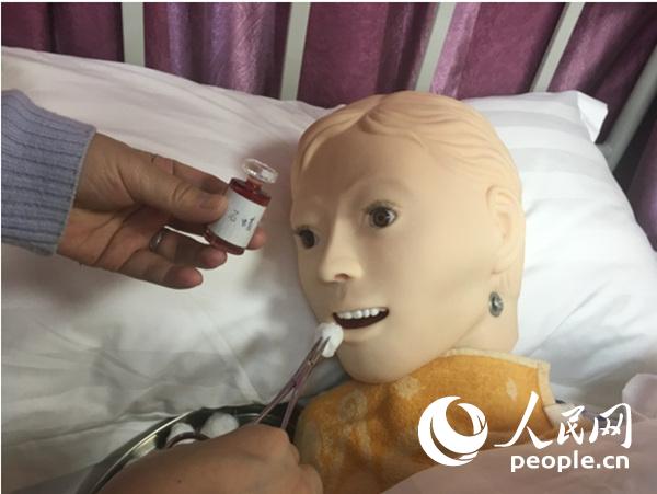護(hù)理者幫助老人將頭側(cè)向一邊,頜下鋪小毛巾,將彎盤置老人口角旁。(“達(dá)醫(yī)曉護(hù)”供圖)