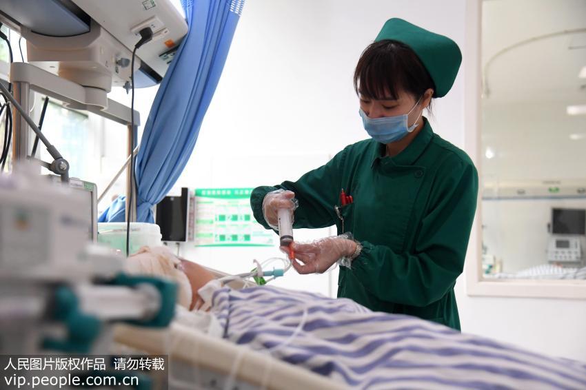 2017年4月17日,江西省新余市人民醫(yī)院EICU護(hù)士在給患者配置鼻飼流質(zhì)食物。(周亮/人民圖片)