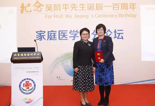 吳階平醫(yī)學(xué)基金會(huì)理事長(zhǎng)曉萌為家庭醫(yī)學(xué)部首屆主任委員遲春花頒發(fā)聘書(shū)