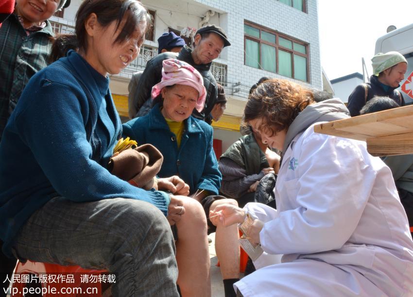 2015年3月12日,貴州省錦屏縣中醫(yī)醫(yī)院組織院內(nèi)資深醫(yī)務(wù)人員深入該縣彥洞鄉(xiāng)開(kāi)展“春天送健康免費(fèi)義診”活動(dòng),醫(yī)生正在給一名痛風(fēng)群眾扎銀針。