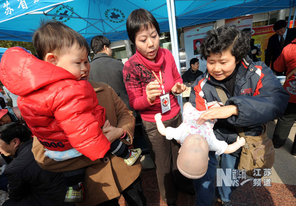 “海姆利克”急救法:對于吸入性窒息患者而言,最為理想的辦法是用美國醫(yī)學會推薦的“海姆利克”急救法進行急救。其急救原理是當窒息發(fā)生時,患者肺內殘留的氣體可以給膈肌一種突然向上的壓力,使胸腔壓力驟然升高,壓迫雙肺,驅使肺內殘存的氣流進入氣管,從而排出卡在氣管口的食物或其他異物。其具體操作方法是讓意識尚清醒的患者采用立位或坐位,搶救者站在患者背后,雙臂環(huán)抱患者,一手握拳,使拇指掌關節(jié)突出點頂住患者肚臍上方(上腹部中央),另一只手的手掌壓在拳頭上,連續(xù)快速向內、向上推壓沖擊6-10次(注意不要傷到患者的肋骨)。反復實施,直至阻塞物被吐出為止。(姜春雷)