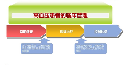高血壓患者的臨床管理,應(yīng)早期篩查、確診是否為高血壓患者,確定影響血壓管理的其他危險因素;及時并規(guī)律地給予降壓藥物治療;最大可能控制血壓達(dá)標(biāo)。